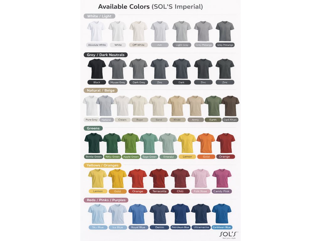 Kromě základních barev je možné tričko objednat také v dalších barevných variantách z kompletní barevné palety výrobce. Přehled všech dostupných odstínů je uveden na obrázku se vzorky barev.